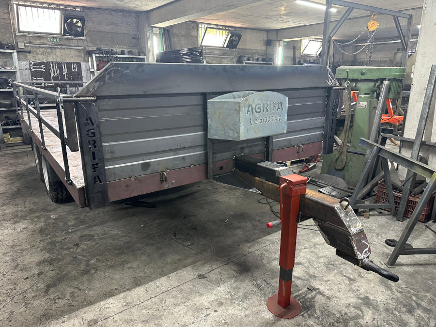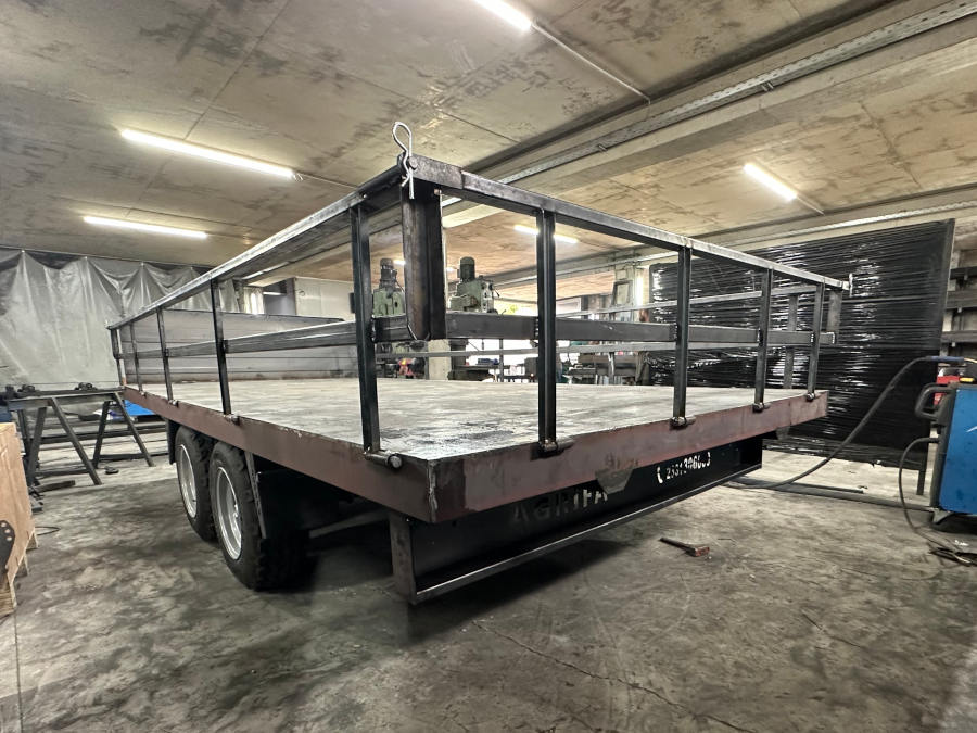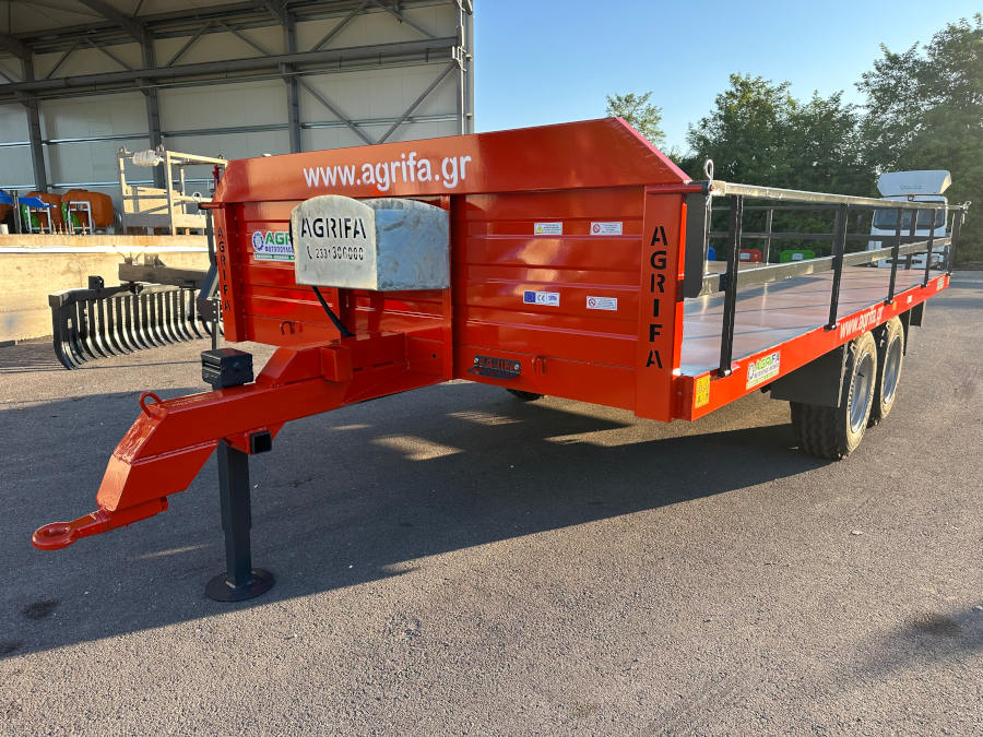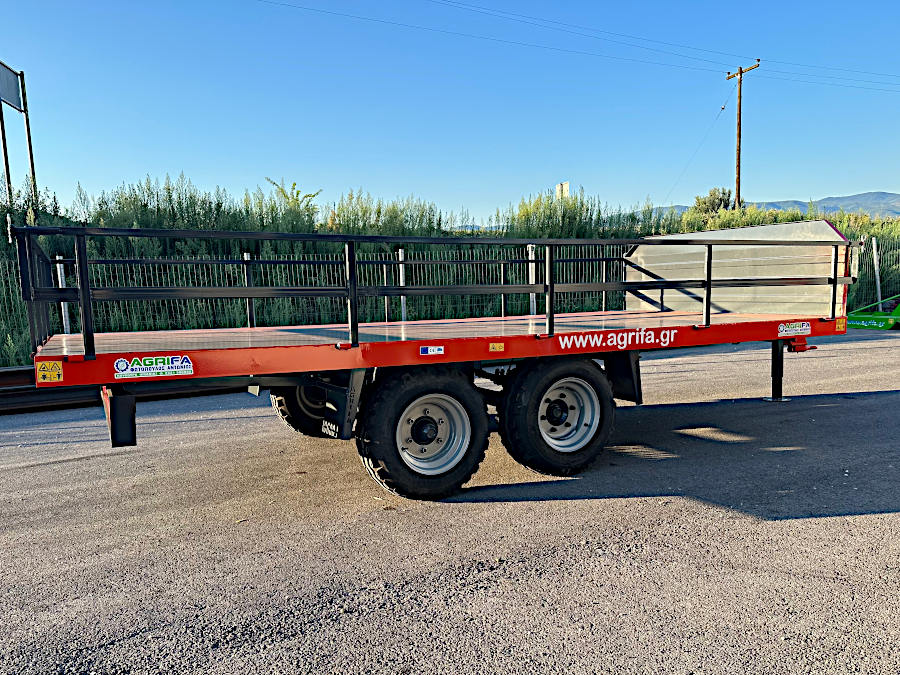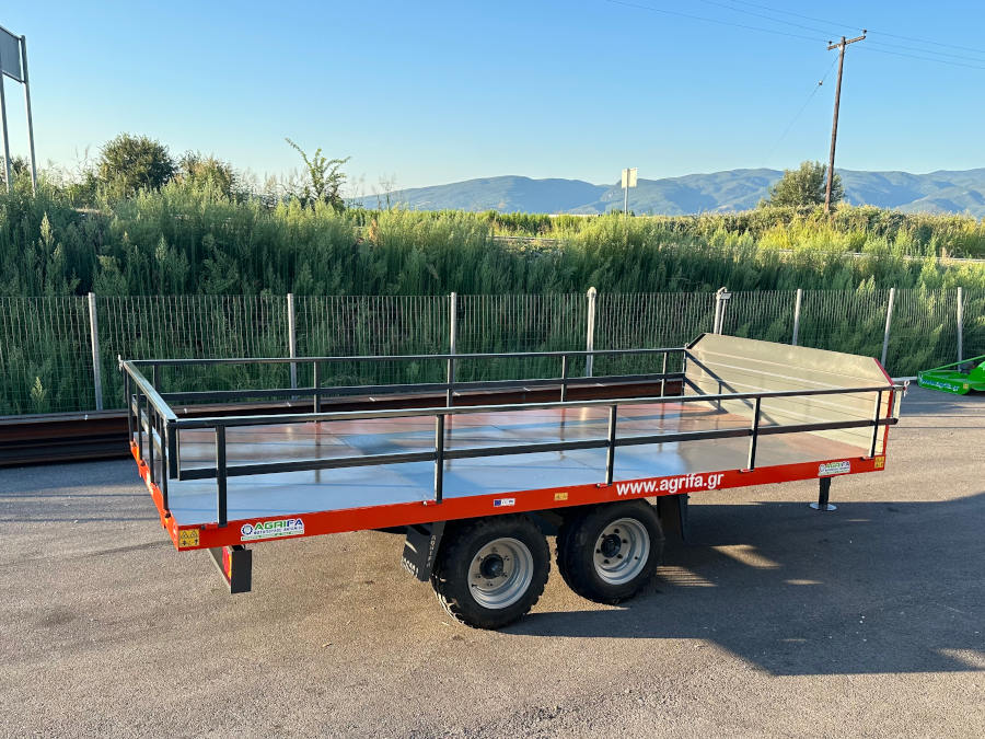 Ρυμούλκα, καρότσα, πλατφόρμα για τρακτέρ 16t.Διαξονική πλατφόρμα, τρέιλερ, καρότσα αγροτικής χρήσης με ελαστικά αγροτικών μηχανημάτων χαμηλού υψους, ανοιγώμενα – αποσπώμενα κιγκλιδώματα, φρένα κτλ, οπου και την καθιστά άνετη στην λειτουργία, προσαρμόζοντας εύκολα στις απαιτήσεις του κάθε χρήστη. Διαξονικές συρόμενες πλατφόρμες μεταφοράς αγροτικών προιοντων με ύψος φόρτωσης (83cm+- από το έδαφος)και ωφέλιμο φορτίο 7000kg. Ρυμούλκα, καρότσα για τρακτέρ με 4 εσωτερικούς της καρότσας τροχούς για ασφαλείς και ξεκούραστες μεταφορές όλων των ειδών φορτίου.(Κατάλληλη για φόρτωση και μεταφορά με πλαστικά παλετοκιβώτια – Bins, παλέτες, κλούβες κτλ.)