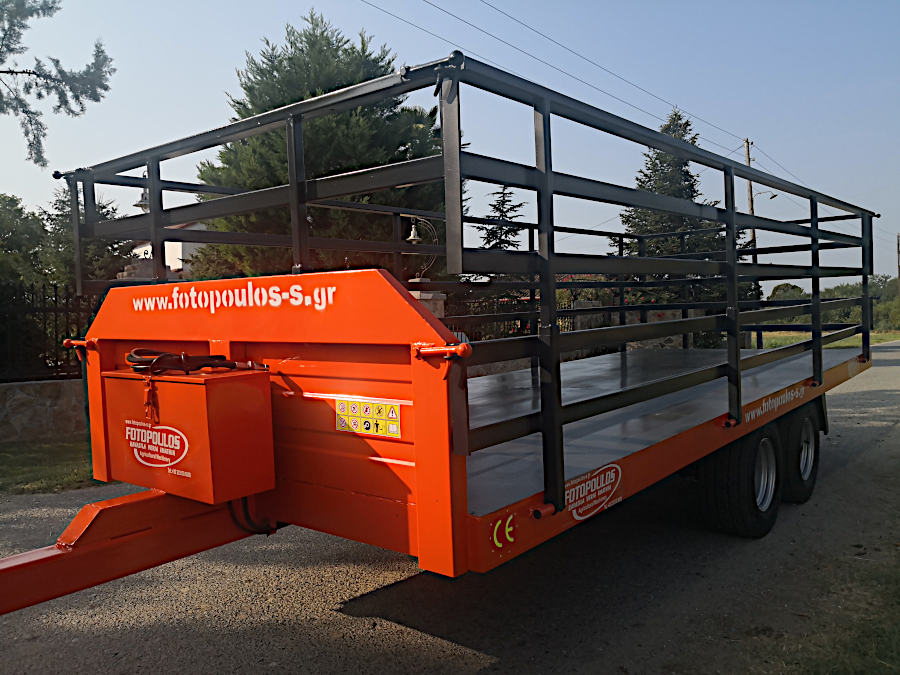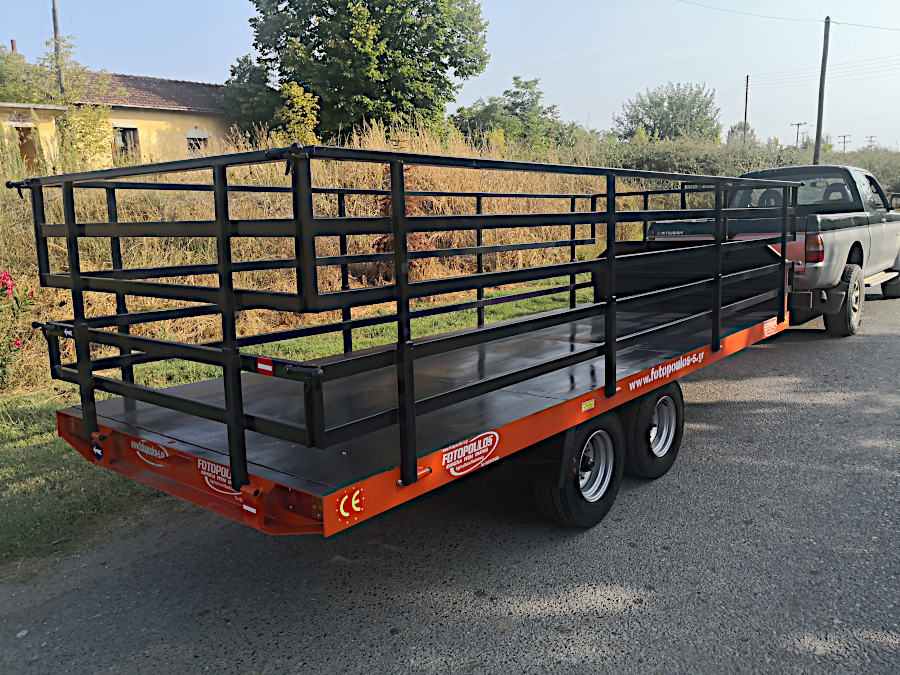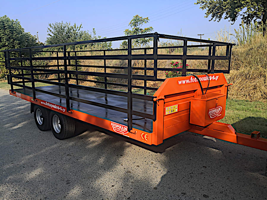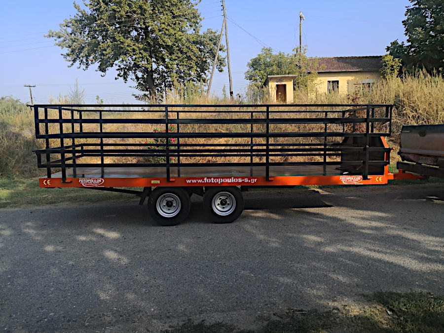 Καρότσα, πλατφόρμα για τρακτέρ 4t.Διαξονική πλατφόρμα, τρέιλερ με ελαστικά ενισχυμένα, αποσπώμενα διπλά κιγκλιδώματα, φρένα κ.α που είναι άνετη στην χρήση και προσάρμόζεται εύκολα στις απαιτήσεις του κάθε χρήστη. Διαξονικές συρόμενες πλατφόρμες μεταφοράς αγροτικών προιοντων με ύψος φόρτωσης (64cm από το έδαφος)και ωφέλιμο φορτίο 4000kg. Ρυμούλκα, καρότσα για τρακτέρ με 4 εσωτερικούς της καρότσας τροχούς για ασφαλείς και ξεκούραστες μεταφορές όλων των ειδών φορτίου.(Κατάλληλη για φόρτωση και μεταφορά φρούτων, ελιές κ.α μέσα σε πλαστικά τελάρα.)